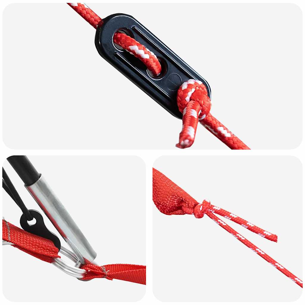 - Komplett campingoppsett Sett inneholder teltduk, avtakbar regnfilm, et solid stangsett, en praktisk bærenett, barduner for ekstra stabilitet, og bakkenakker for forankring. Alle deler jobber sammen for en stressfri campingsituasjon og gjør oppsett og nedtak snakkende enkelt.