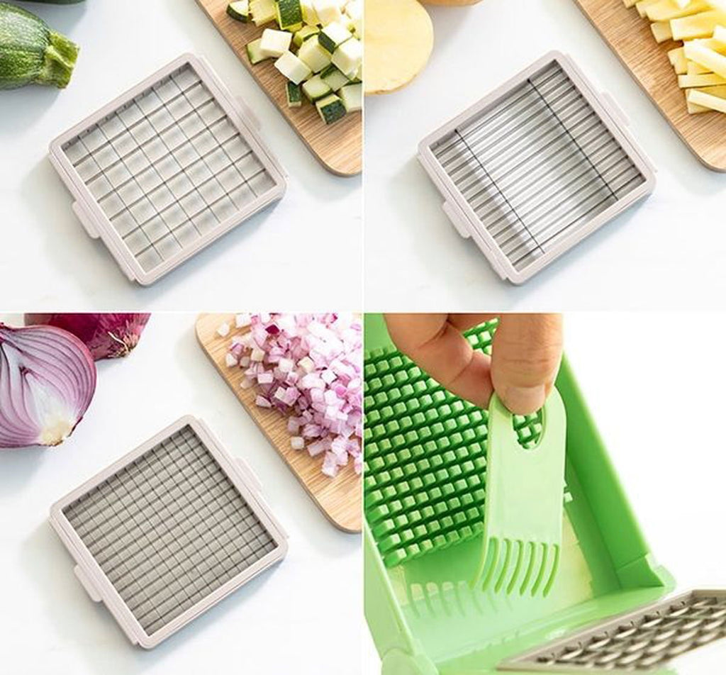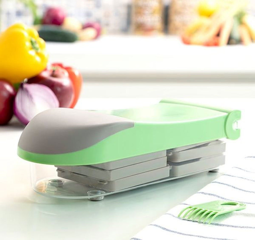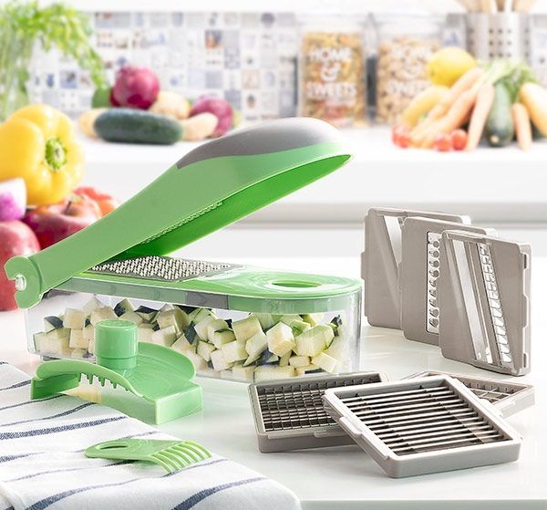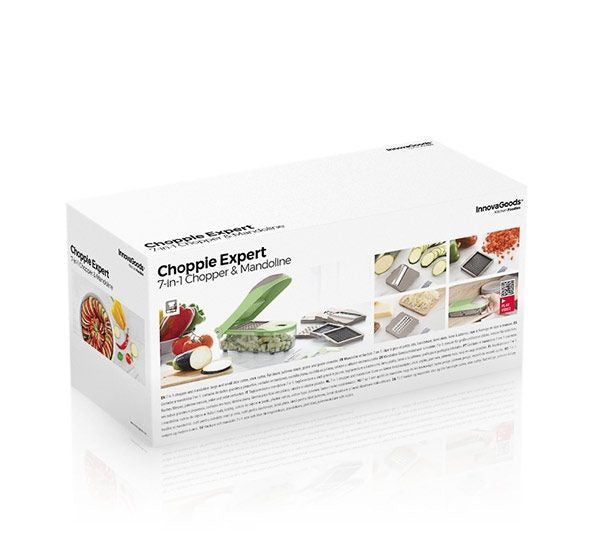 En komplett og innovativ manuell grønnsaksskjærer med oppskrifter og tilbehør som du ikke vil gå glipp av på kjøkkenet ditt, da det sparer så mye tid og krefter. Det lar deg enkelt lage opptil syv typer skjæring: store terninger, små terninger, tykke strimler (pinner), skiver, julienne, riving og kverning. De sklisikre føttene på beholderen gir større komfort og stabilitet under bruk. Det praktiske og kompakte designet gjør det også veldig enkelt å montere og demontere for rengjøring, og det tar minst mulig lagringsplass. Den inkluderer også en fingerbeskytter og en rengjøringsbørste.