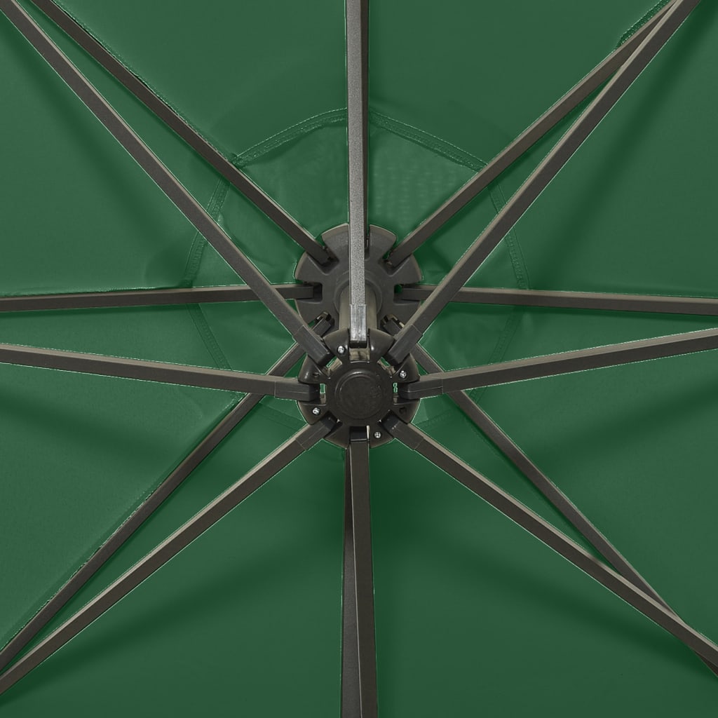 Parasolskjermen, laget av UV-beskyttende og anti-falmende polyester, gir deg optimal beskyttelse mot solen, og er lett å rengjøre. Den har en solid kryssbase for ekstra stabilitet. Hageparasollens eksklusive design lar deg vippe og rotere den 360 grader for å blokkere solen fra alle vinkler. Den sterke aluminiumsstangen, sammen med de 8 spilene, gjør parasollen veldig stabil og holdbar. Denne hageparaplyen kan enkelt åpnes og lukkes takket være sveivemekanismen. Denne terrasseparasollen har 24 lysdioder for å belyse uterommet og skape en koselig og romantisk atmosfære når solen går ned.