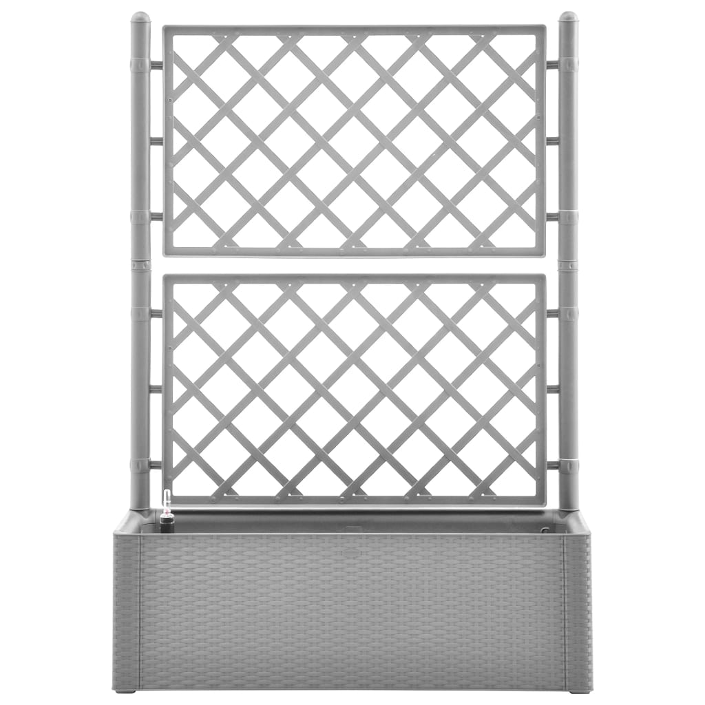Det innebygde espalieret gir utmerket støtte for klatreplanter, som urter, tomater, bønner osv. Det er laget av robust UV-, vær- og frostbestandig plast, som gjør det egnet for innendørs og utendørs bruk. Designet ligner en ekte rottingstruktur. Materialet er vaskbart og lett å rengjøre. I tillegg kan denne kassen automatisk vanne planter ved å transportere fuktighet fra vannbeholderen på 90 liter, og har hull for vannoverløp for å forhindre overvanning. Nivåindikatoren er inkludert.