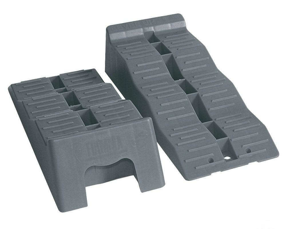 Tre nivåer.Max belastning 8tonn.Mål LxBxH: 58x24x14cm.Egenvekt 3,8kg.Farge grå.Inkl. bag.Selges i sett á 2stk.