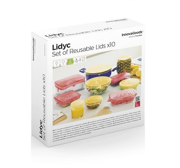Et sett med 10 regulerbare silikonlokk for å lukke og hermetisk forsegle et mangfold av bokser for optimal matoppbevaring, reduser matsvinn.