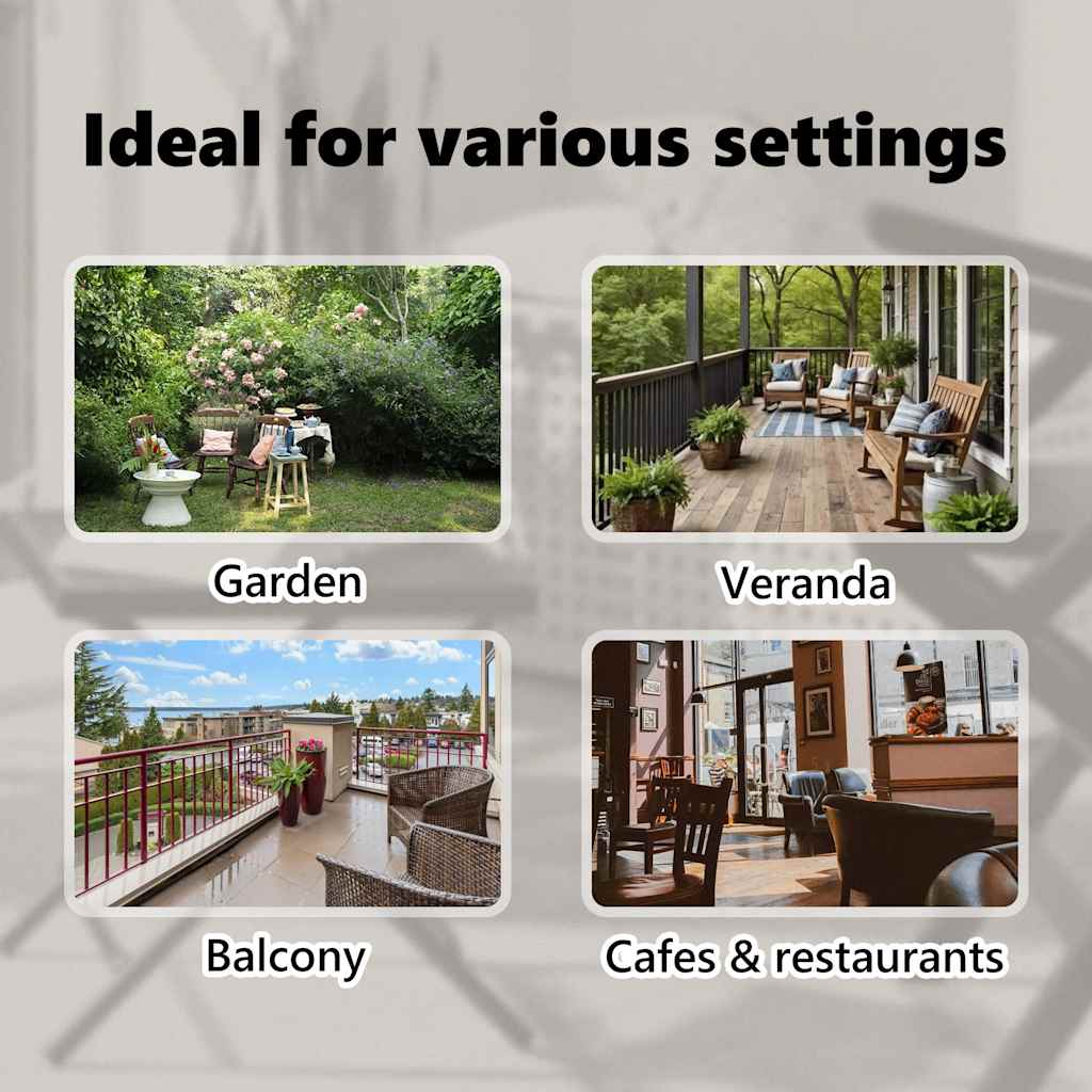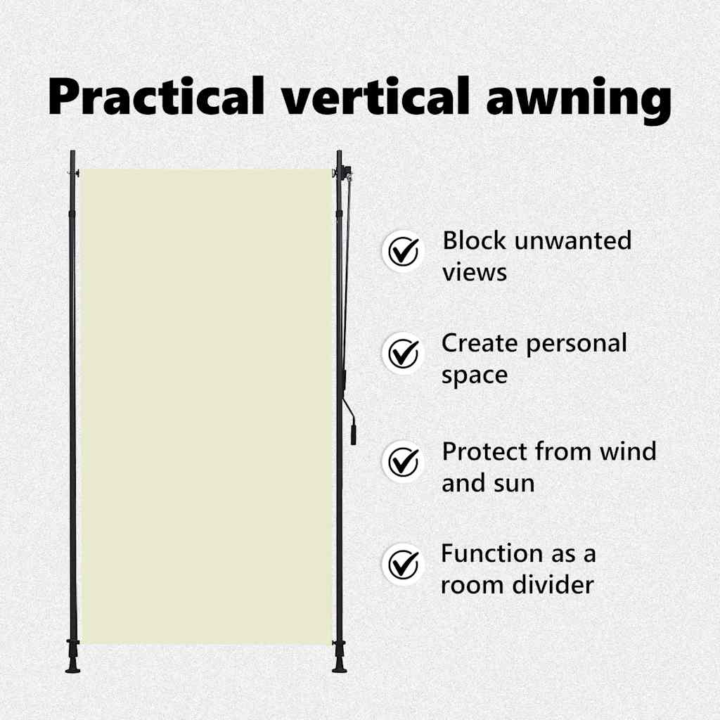 Denne gardinen av kvalitetsstoff med PA-belegg er falmebestandig og kan blokkere solen mens den lar luft strømme gjennom. Den kan enkelt rulles opp og ned med det hånddrevne systemet. Denne vertikale gardinen har to stående stolper med justerbar høyde fra 2 til 3 m. Den kan passe til de fleste takhøyder og sikre enkel montering.